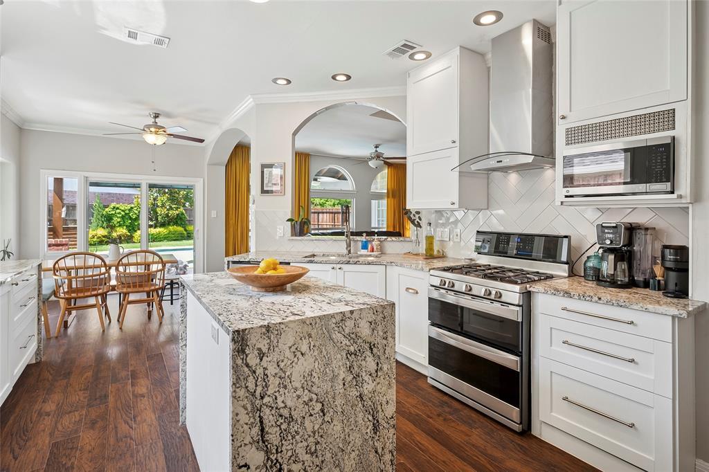 The living room centers around a sleek, modern gas fireplace (updated 2023), while the chef’s kitchen stuns with granite waterfall countertops, herringbone backsplash, and 9-ft custom cabinets (installed 2023) featuring soft-close drawers, under-cabinet lighting, and a stainless-steel vent hood. A 2023 Pella sliding glass door with built-in custom doggy door opens to your backyard oasis—complete with a covered patio, firepit, herb garden, and shed.